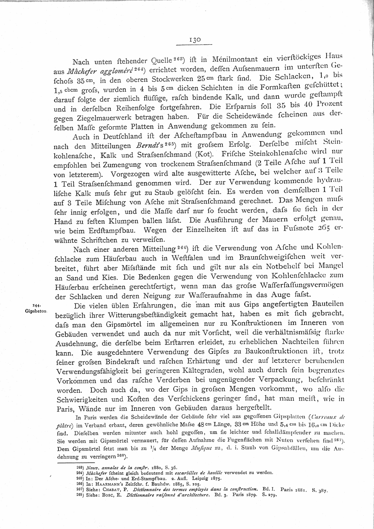 Der Aschestampfbau oder Cendrinbau ist seit etwa Mitte dieses Jahrhunderts in ziemlicher Ausdehnung in der Gegend von Lyon verwendet worden. Ein Bericht Louvier's an die Société centrale des architectes macht darüber nähere Mitteilungen 262). Nach demselben ist das übliche Mischungsverhältnis: 4 Teile Schlacke auf 1 Teil Kalk. Man hat gefunden, daß mit Fettkalk bei etwas höherem Kalkzusatz mehr Festigkeit erzielt wird als mit hydraulischem Kalk in dem angegebenen Verhältnis. Die Herstellung der Mauern aus Aschestampfmasse erfolgt in derselben Weise wie beim Erdstampfbau, wobei die Höhe der zu stampfenden Schichten zu 12cm angenommen wird. Da die gewöhnliche Stärke von Außenmauern 50cm, die von Scheidemauern 15 bis 20cm ist, so kann die Festigkeit der Masse keine sehr bedeutende sein; sie ist offenbar wesentlich geringer als die des beim Betonbau besprochenen Schlackenbetons mit Portlandcement. Die Mauern sollen sich sehr gut im Feuer gehalten haben.