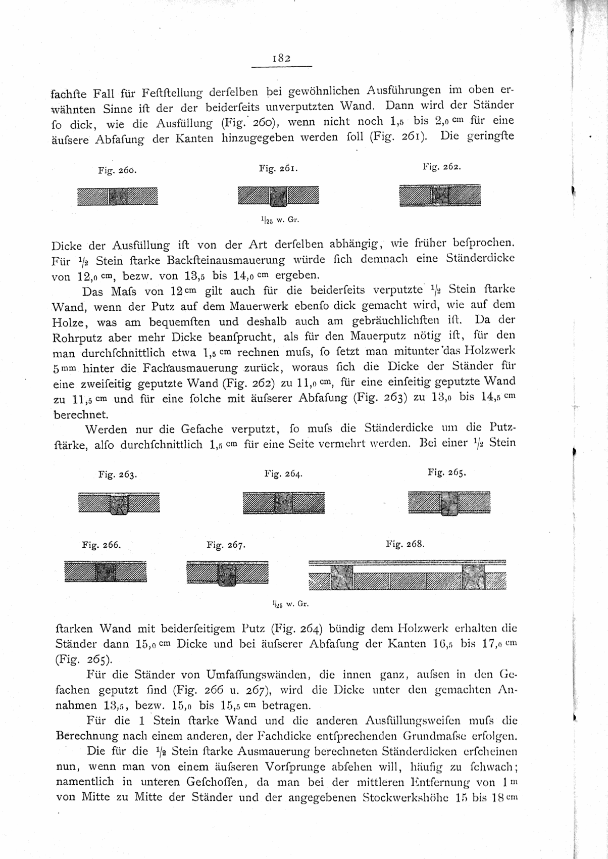fachste Fall für Feststellung derselben bei gewöhnlichen Ausführungen im oben erwähnten Sinne ist der der beiderseits unverputzten Wand. Dann wird der Ständer so dick, wie die Ausfüllung (Fig. 260), wenn nicht noch 1,5 bis 2,0cm für eine äußere Abfasung der Kanten hinzugegeben werden soll (Fig. 261). Die geringste Dicke der Ausfüllung ist von der Art derselben abhängig, wie früher besprochen. Für 1/2 Stein starke Backsteinausmauerung würde sich demnach eine Ständerdicke von 12,0cm, bezw. von 13,5 bis 14,0cm ergeben.