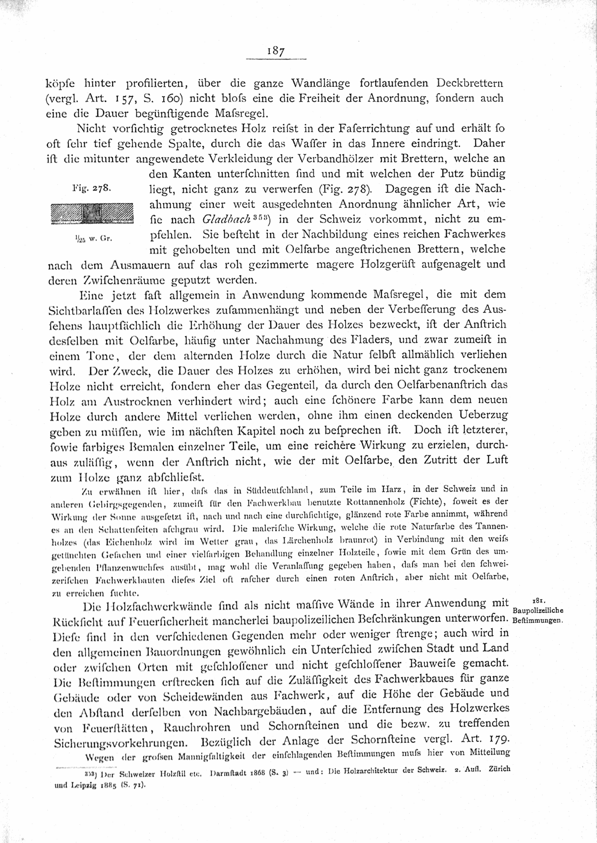Nicht vorsichtig getrocknetes Holz reißt in der Faserrichtung auf und erhält so oft sehr tief gehende Spalte, durch die das Wasser in das Innere eindringt. Daher ist die mitunter angewendete Verkleidung der Verbandhölzer mit Brettern, welche an den Kanten unterschnitten sind und mit welchen der Putz bündig liegt, nicht ganz zu verwerfen (Fig. 278). Dagegen ist die Nachahmung einer weit ausgedehnten Anordnung ähnlicher Art, wie sie nach Gladbach353) in der Schweiz vorkommt, nicht zu empfehlen. Sie besteht in der Nachbildung eines reichen Fachwerkes mit gehobelten und mit Oelfarbe angestrichenen Brettern, welche nach dem Ausmauern auf das roh gezimmerte magere Holzgerüst aufgenagelt und deren Zwischenräume geputzt werden.