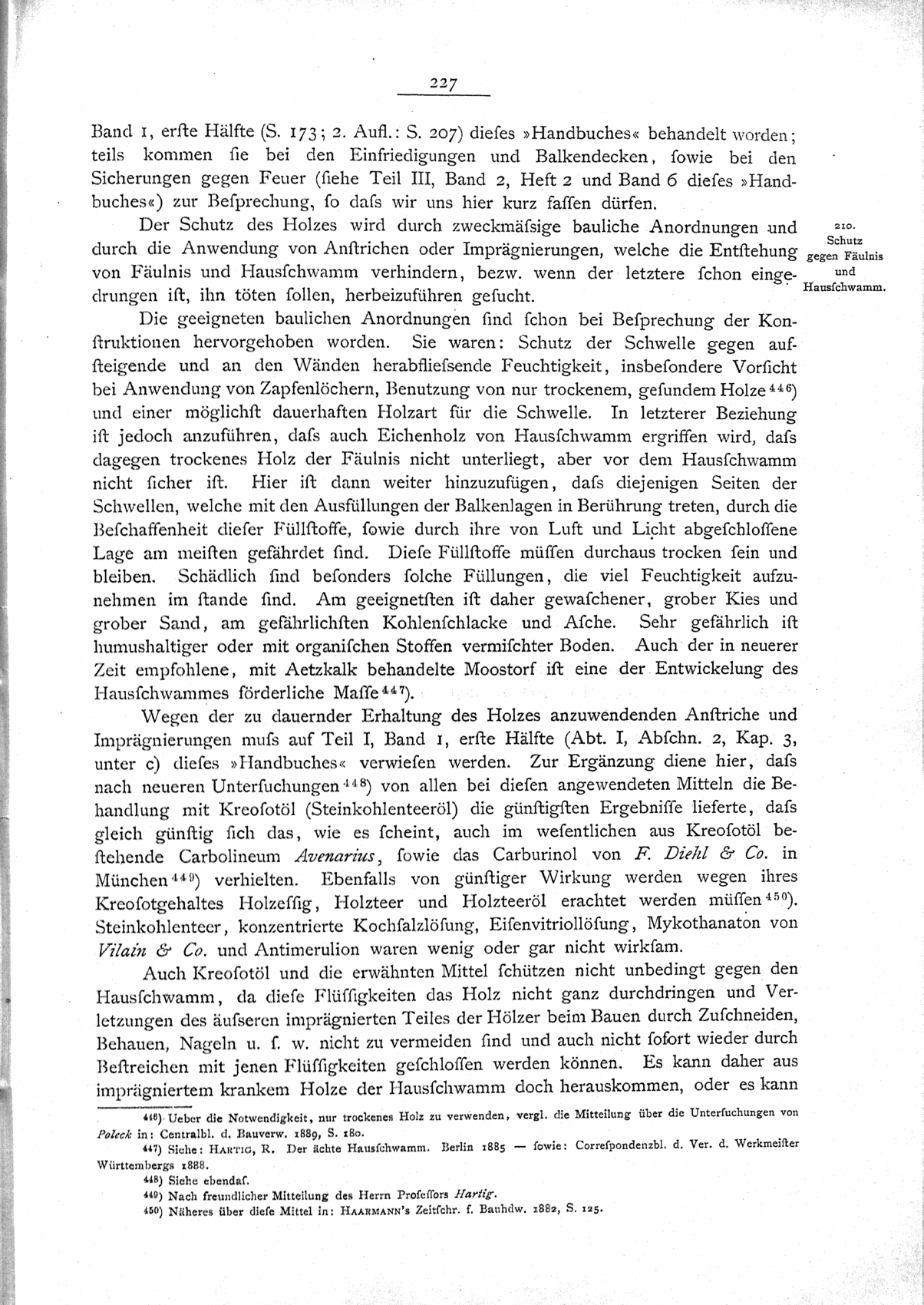 Wegen der zu dauernder Erhaltung des Holzes anzuwendenden Anstriche und Imprägnierungen muß auf Teil I, Band 1, erste Hälfte (Abt. I, Abschn. 2, Kap. 3, unter c) dieses »Handbuches« verwiesen werden. Zur Ergänzung diene hier, daß nach neueren Untersuchungen448) von allen bei diesen angewendeten Mitteln die Behandlung mit Kreosotöl (Steinkohlenteeröl) die günstigsten Ergebnisse lieferte, daß gleich günstig sich das, wie es scheint, auch im wesentlichen aus Kreosotöl bestehende Carbolineum Avenarius, sowie das Carburinol von F. Diehl & Co. in München449) verhielten. Ebenfalls von günstiger Wirkung werden wegen ihres Kreosotgehaltes Holzessig, Holzteer und Holzteeröl erachtet werden müssen450). Steinkohlenteer, konzentrierte Kochsalzlösung, Eisenvitriollösung, Mykothanaton von Vilain & Co. und Antimerulion waren wenig oder gar nicht wirksam.