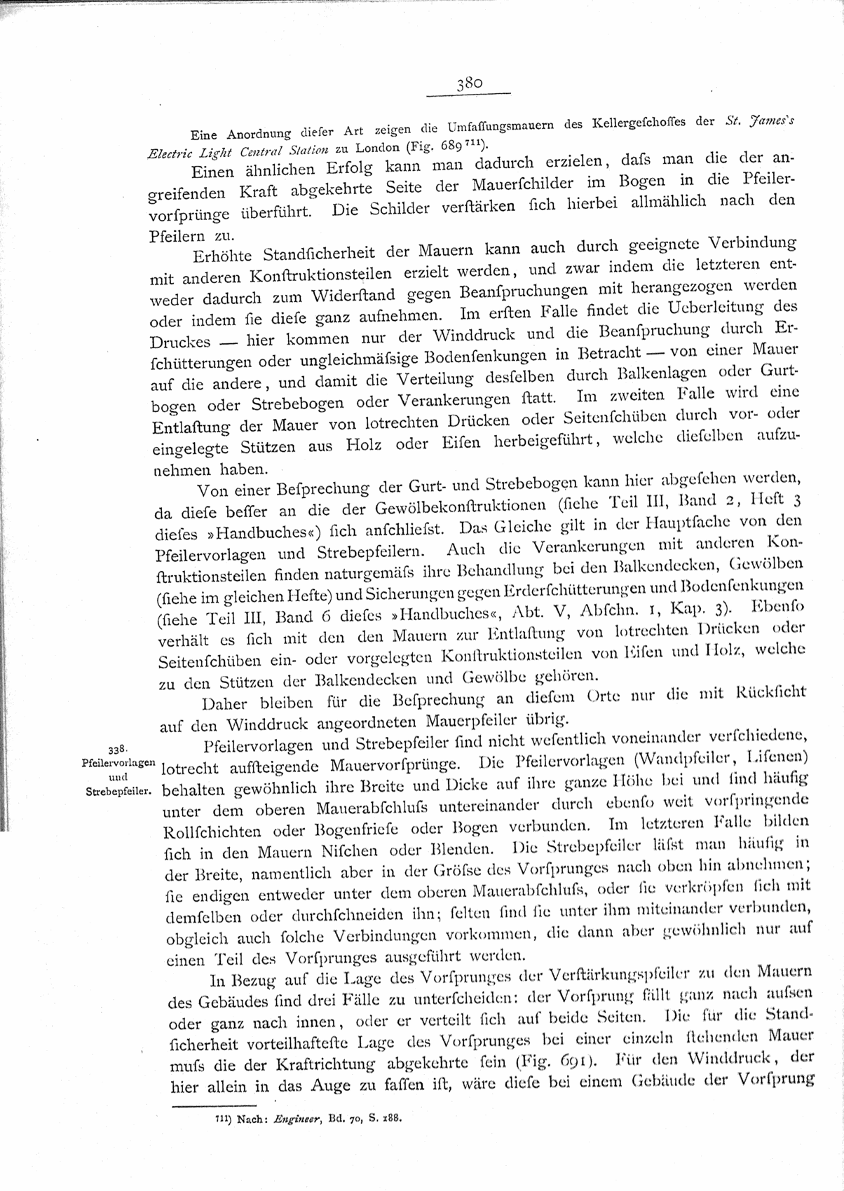 Eine Anordnung dieser Art zeigen die Umfassungsmauern des Kellergeschosses der St. James's Electric Light Central Station zu London (Fig. 689711)).