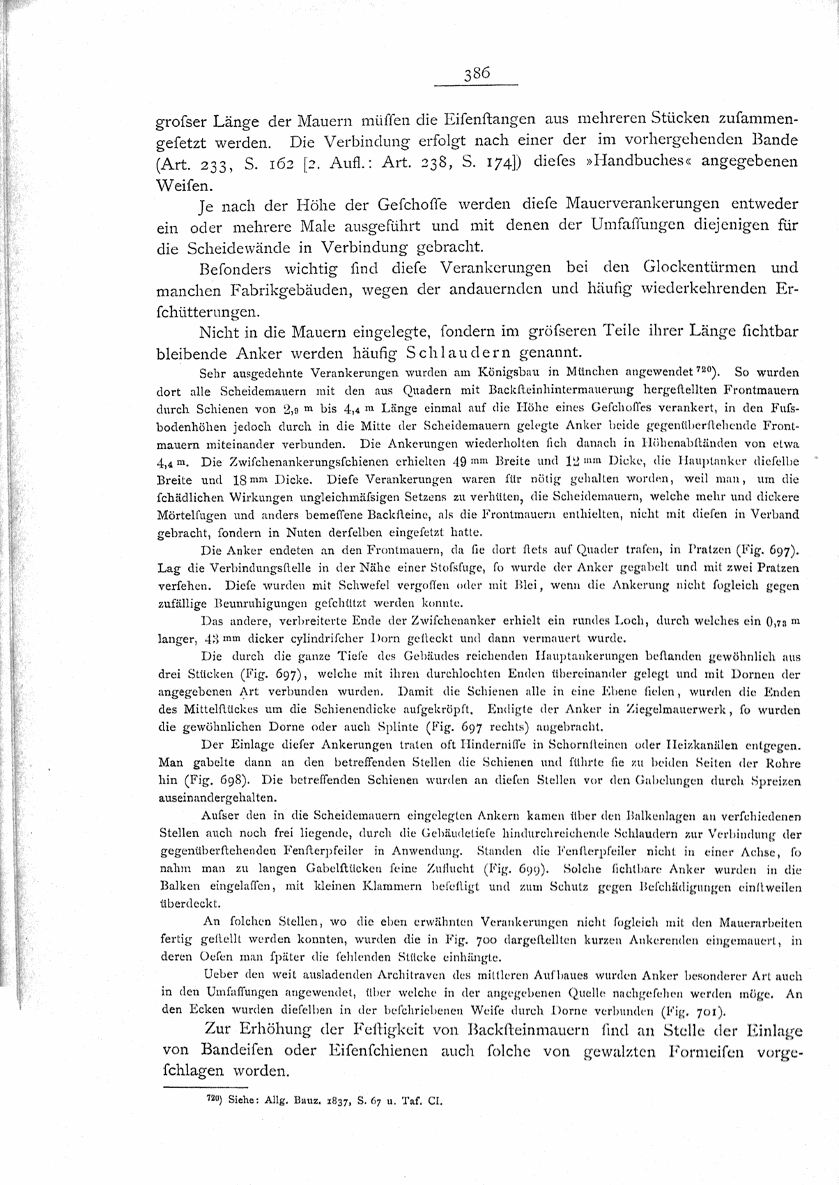 An solchen Stellen, wo die eben erwähnten Verankerungen nicht sogleich mit den Mauerarbeiten fertig gestellt werden konnten, wurden die in Fig. 700 dargestellten kurzen Ankerenden eingemauert, in deren Oesen man später die sehlenden Stücke einhängte.