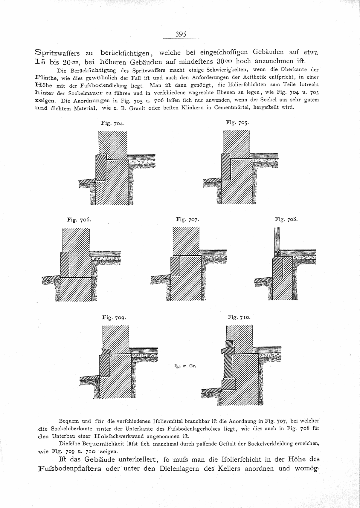 Ist das Gebäude nicht unterkellert, so ist die Isolierschicht nicht bloß über den Grundmauern der Umfassungen, sondern über allen Grundmauern in der Höhe der Plinthe auszuführen, und zwar unter den Fußbodenlagerhölzern des Erdgeschosses, wenn solche vorhanden sind. Dabei ist an den Umfassungen die Einwirkung des