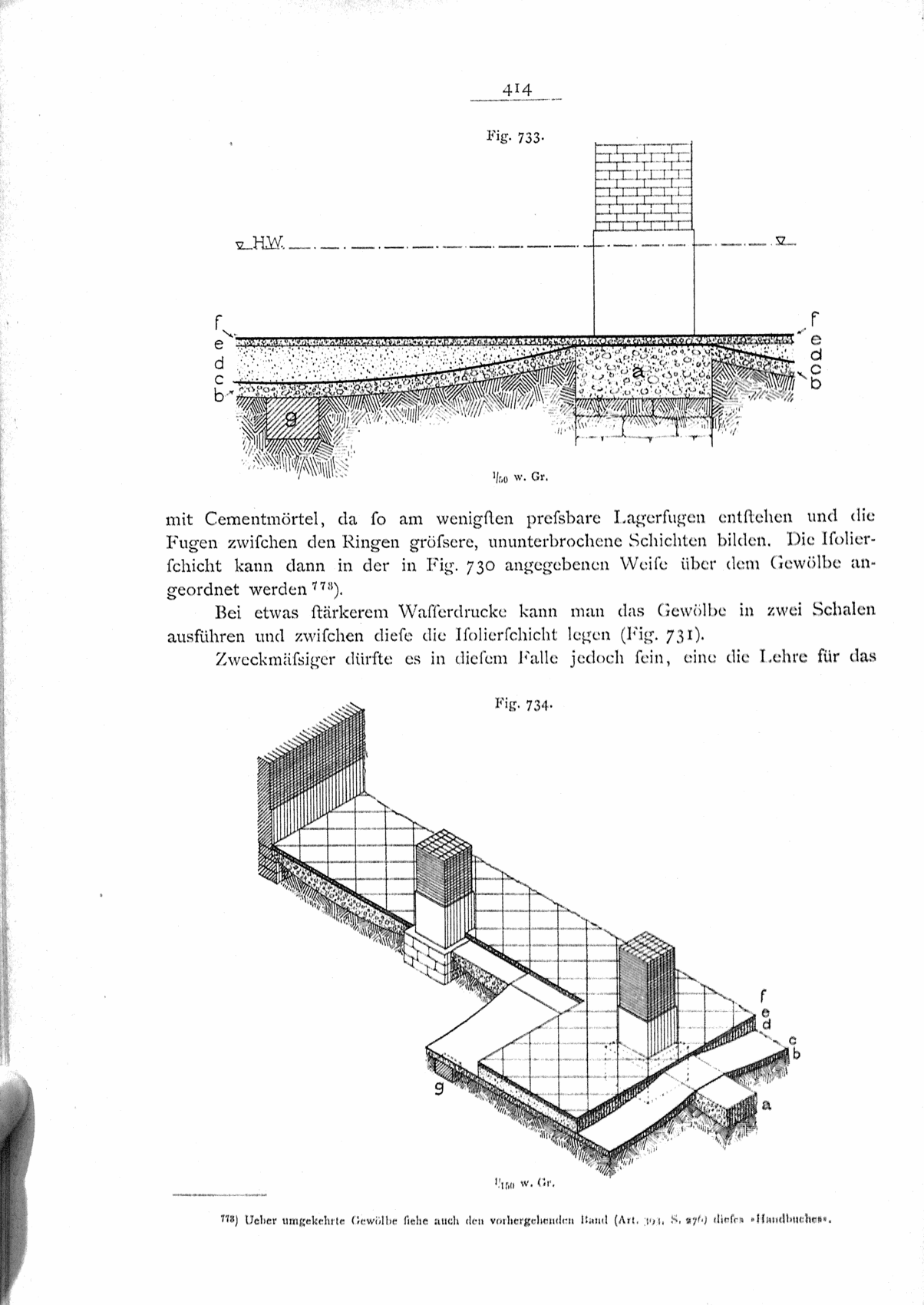 Bei etwas stärkerem Wasserdrucke kann man das Gewölbe in zwei Schalen ausführen und zwischen diese die Isolierschicht legen (Fig. 731).