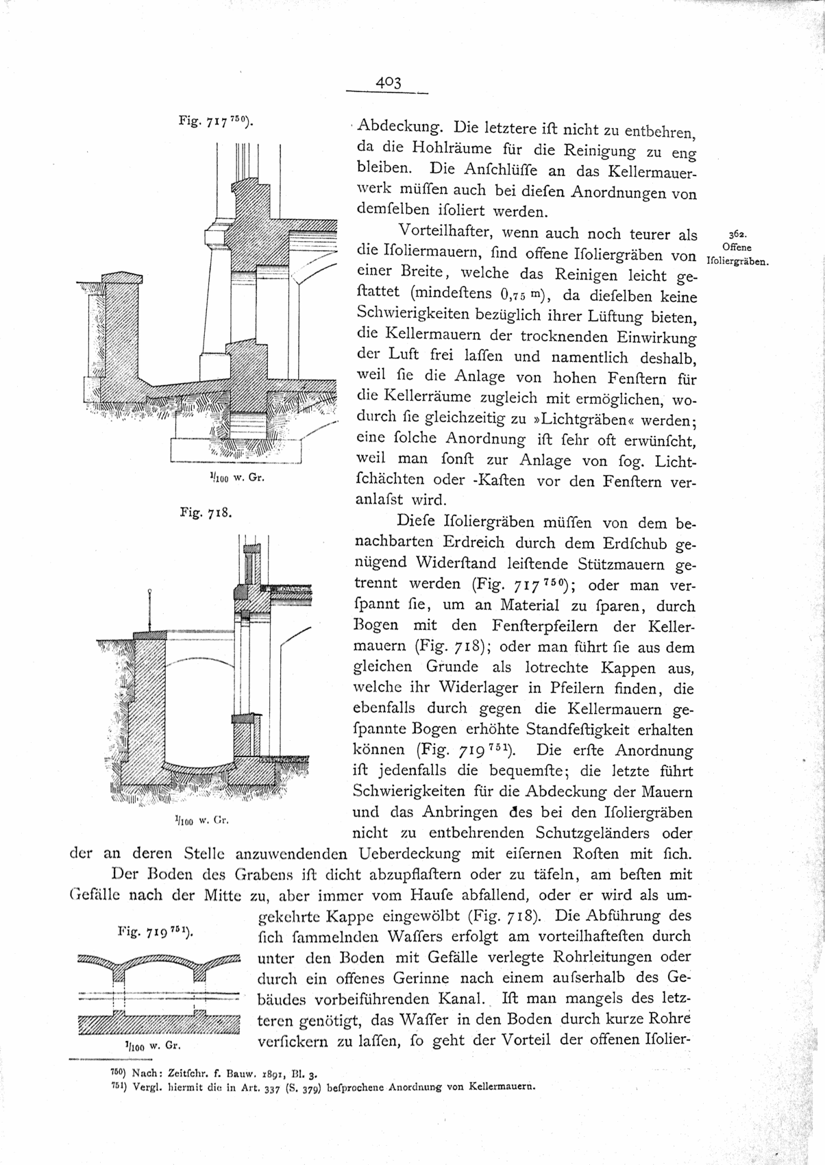 Neben der Anordnung einer der angeführten Maßregeln wird sich immer der in Art. 358 (S. 396) besprochene Ersatz des in der Umgebung der Umfassungsmauern befindlichen durchfeuchteten Erdreiches durch trockenen Sand oder Kies und, wenn es möglich und notwendig erscheint, die Ausführung einer Drainierung empfehlen.