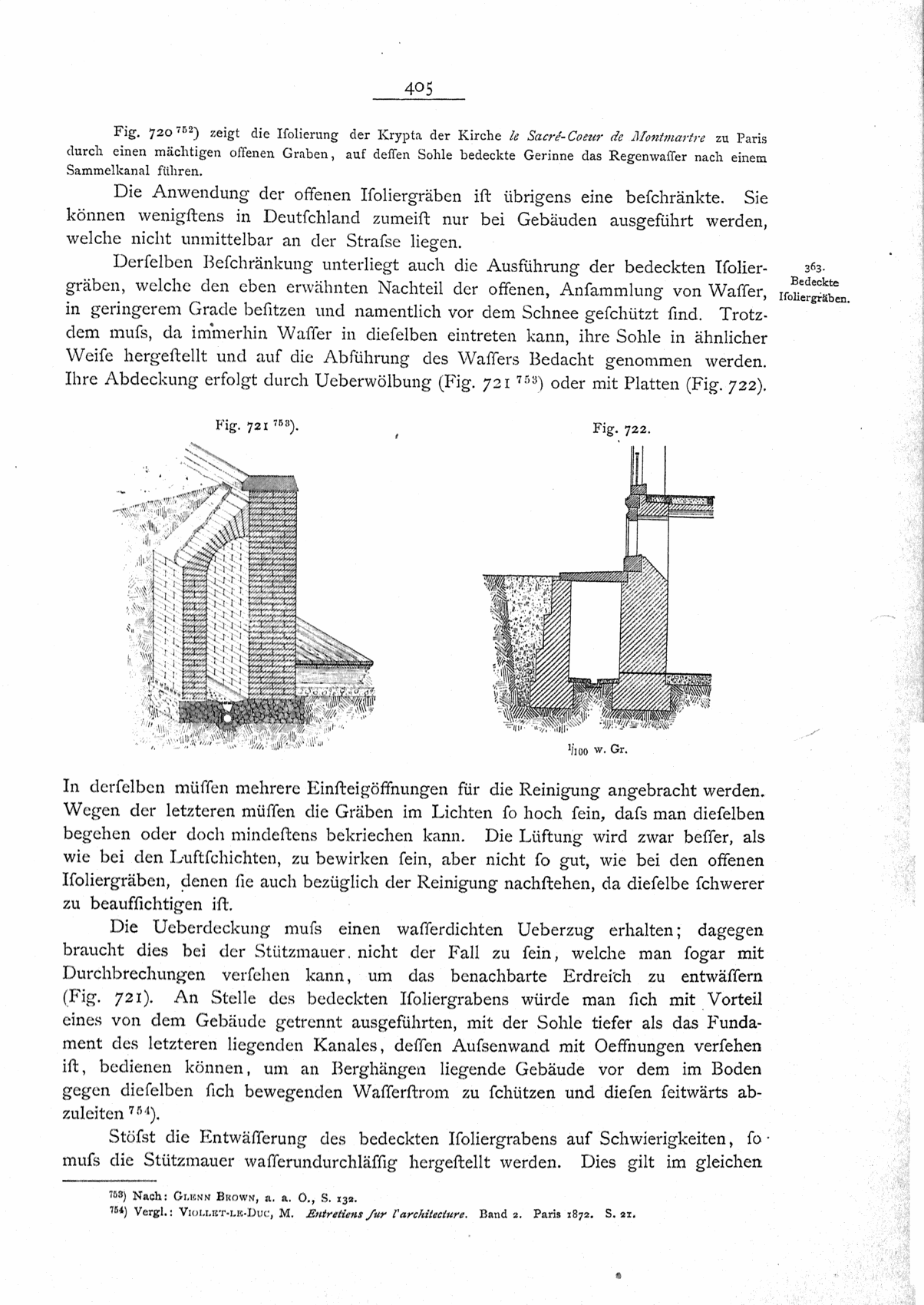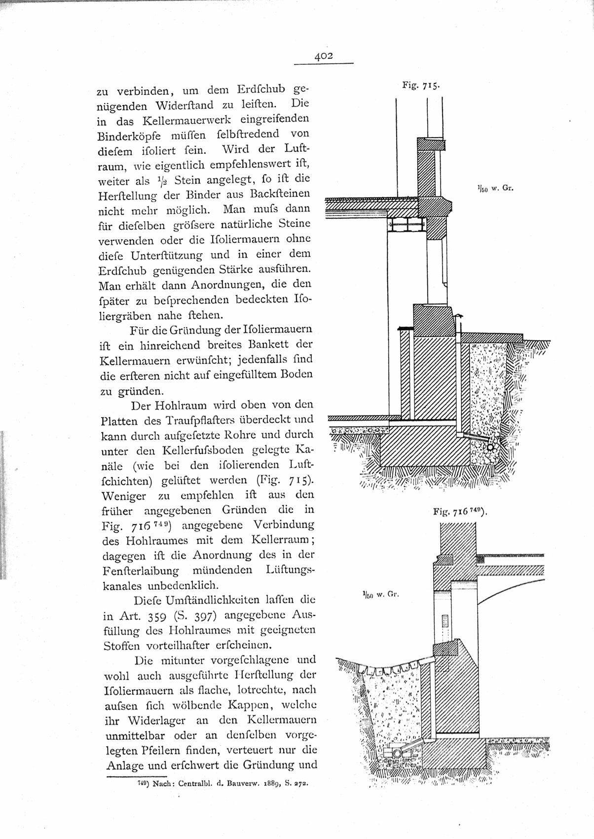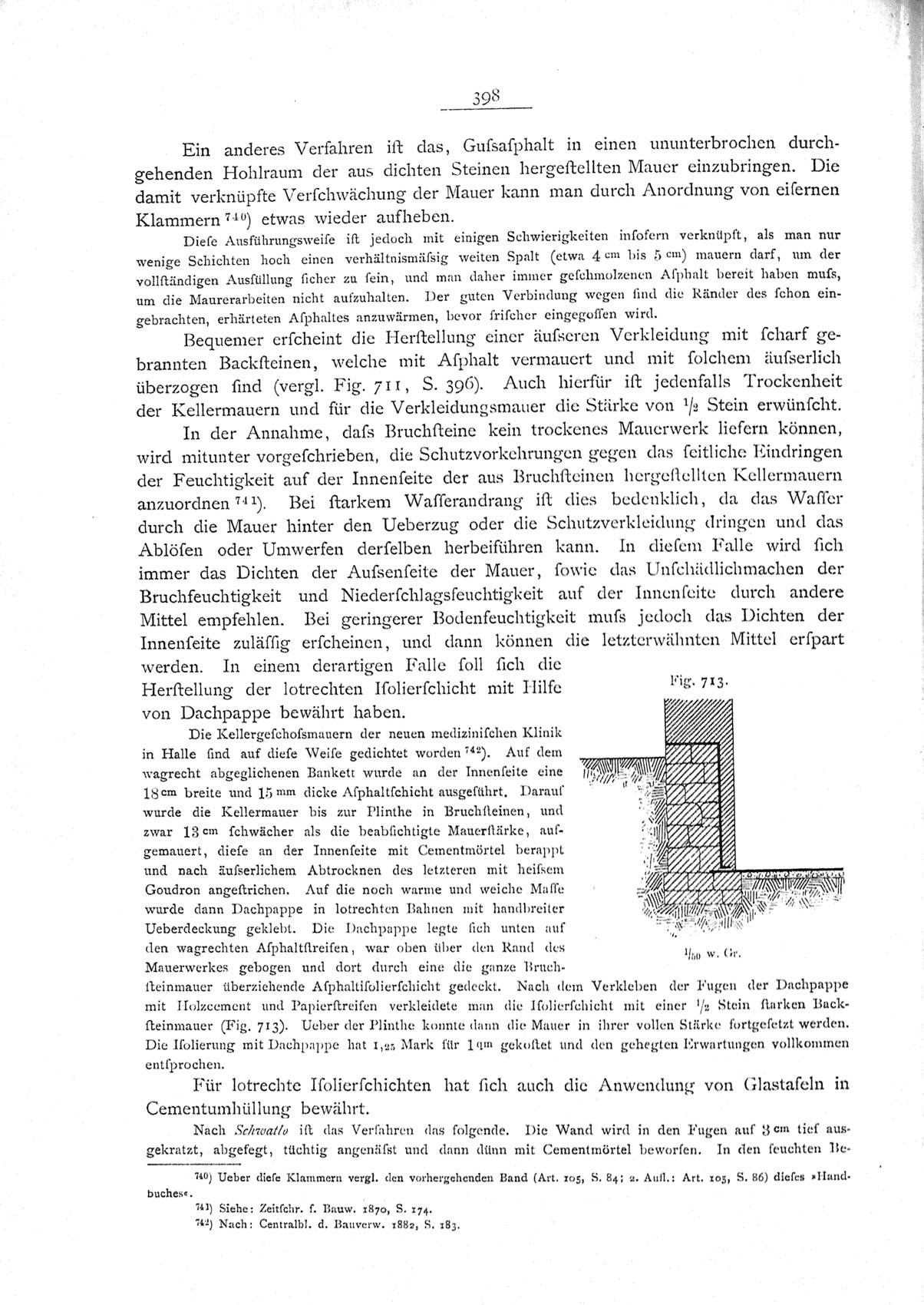 Die Ausführung der Isolierschicht auf der Innenseite kann als Cementputz, ferner mit Cement und Dachziegeln oder Glastafeln, oder endlich mit Asphalt erfolgen (vergl. Art. 359, S. 397).