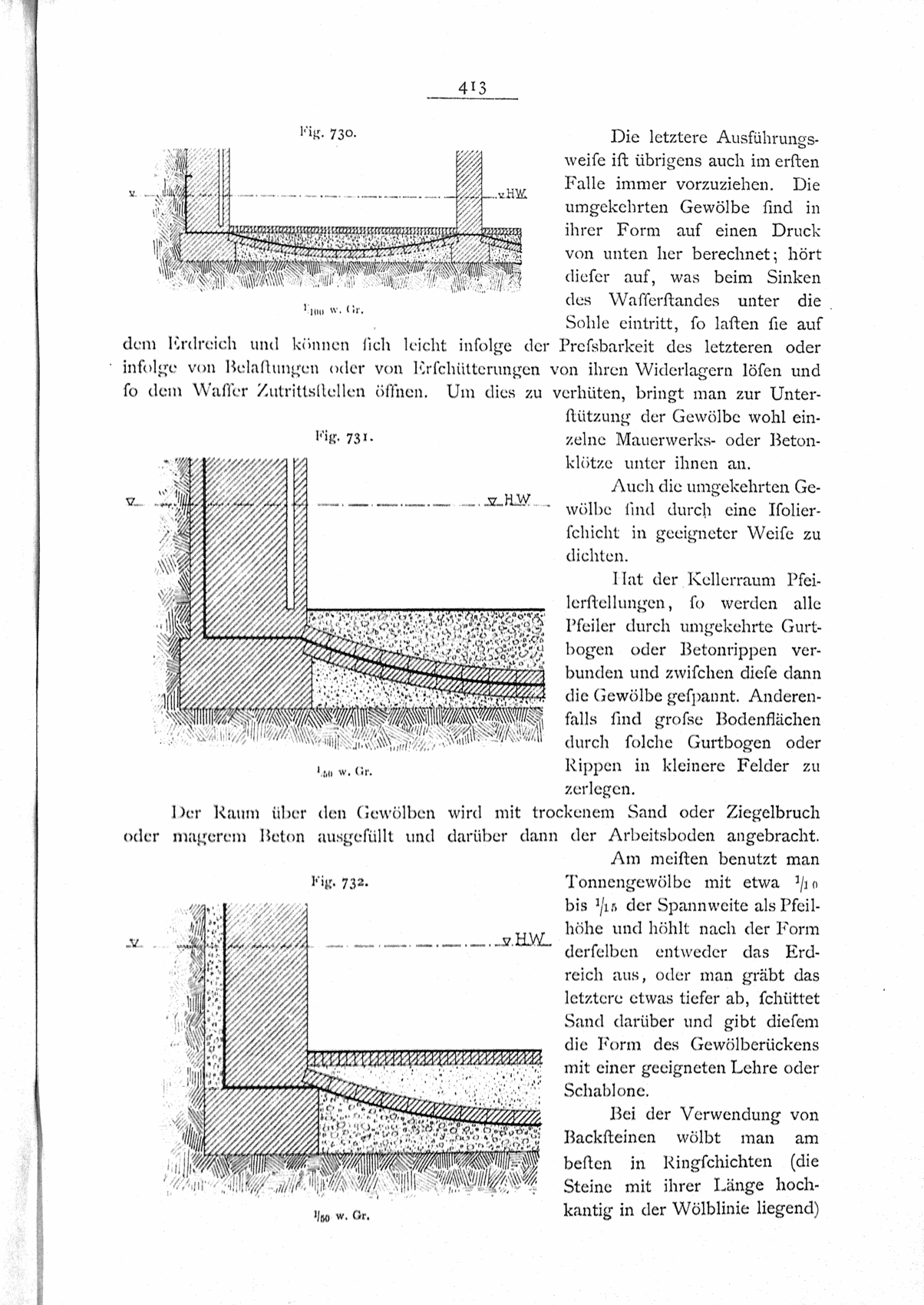 Die aus Stampfbeton hergestellten umgekehrten Gewölbe werden häufig nur 12cm stark gehalten und mit einer wasserdichten Schicht überzogen, worauf dann über einer Ausfüllung der Arbeitsboden folgt. Diese Ausführungsweise kann selbstredend nur geringem Wasserdrucke genügen.