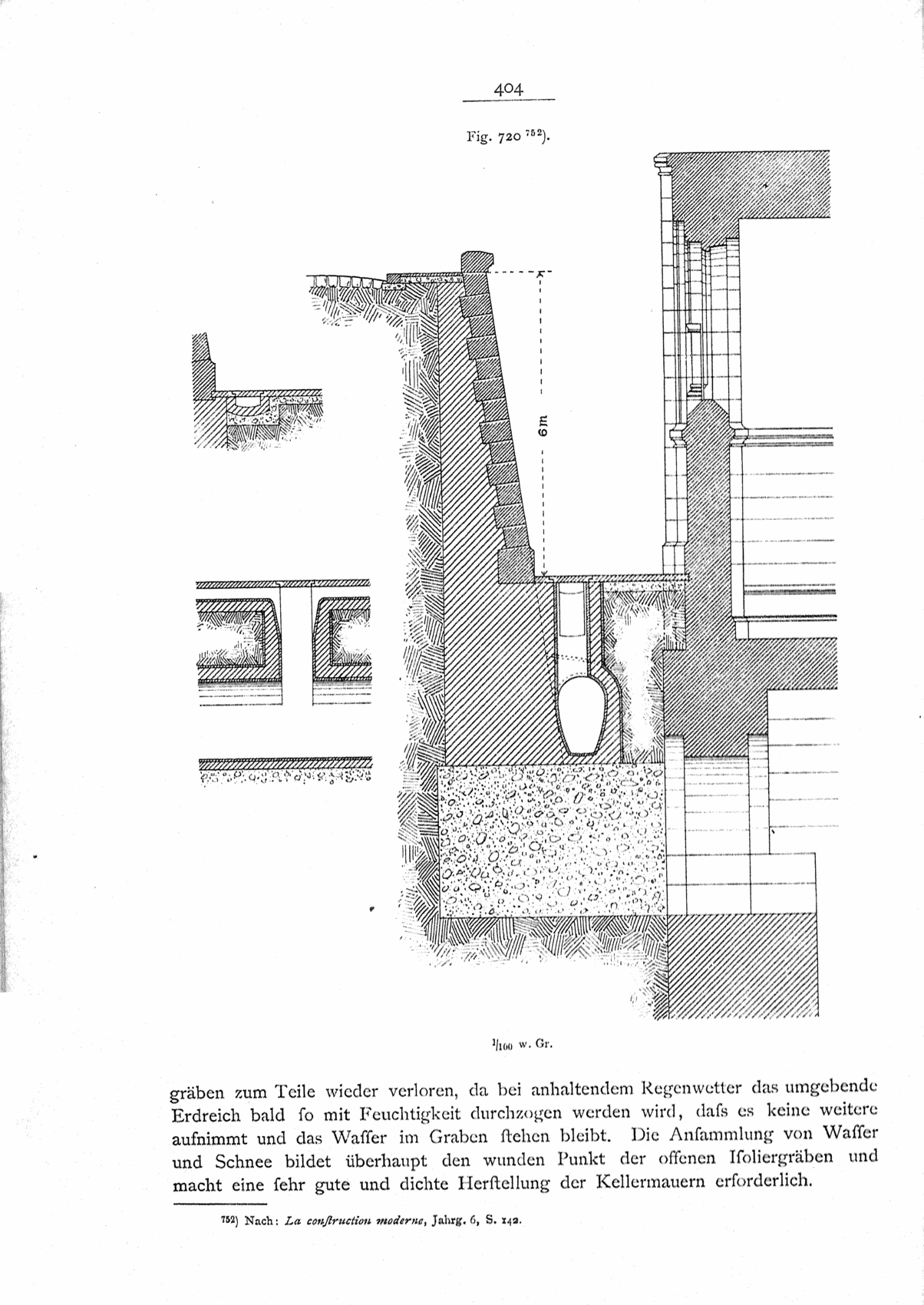 Zweckmäßiger dürfte es jedenfalls sein, trotz der etwas höheren Kosten, einen wirklichen Beton zur Ausfüllung des Grabens zu verwenden und zum Zwecke des Austrocknens der Mauern zwischen ihm und den letzteren einen Hohlraum zu belassen, der entweder bleiben und später abgedeckt oder nach erreichter Trockenheit der Mauern mit Beton verfüllt werden kann.