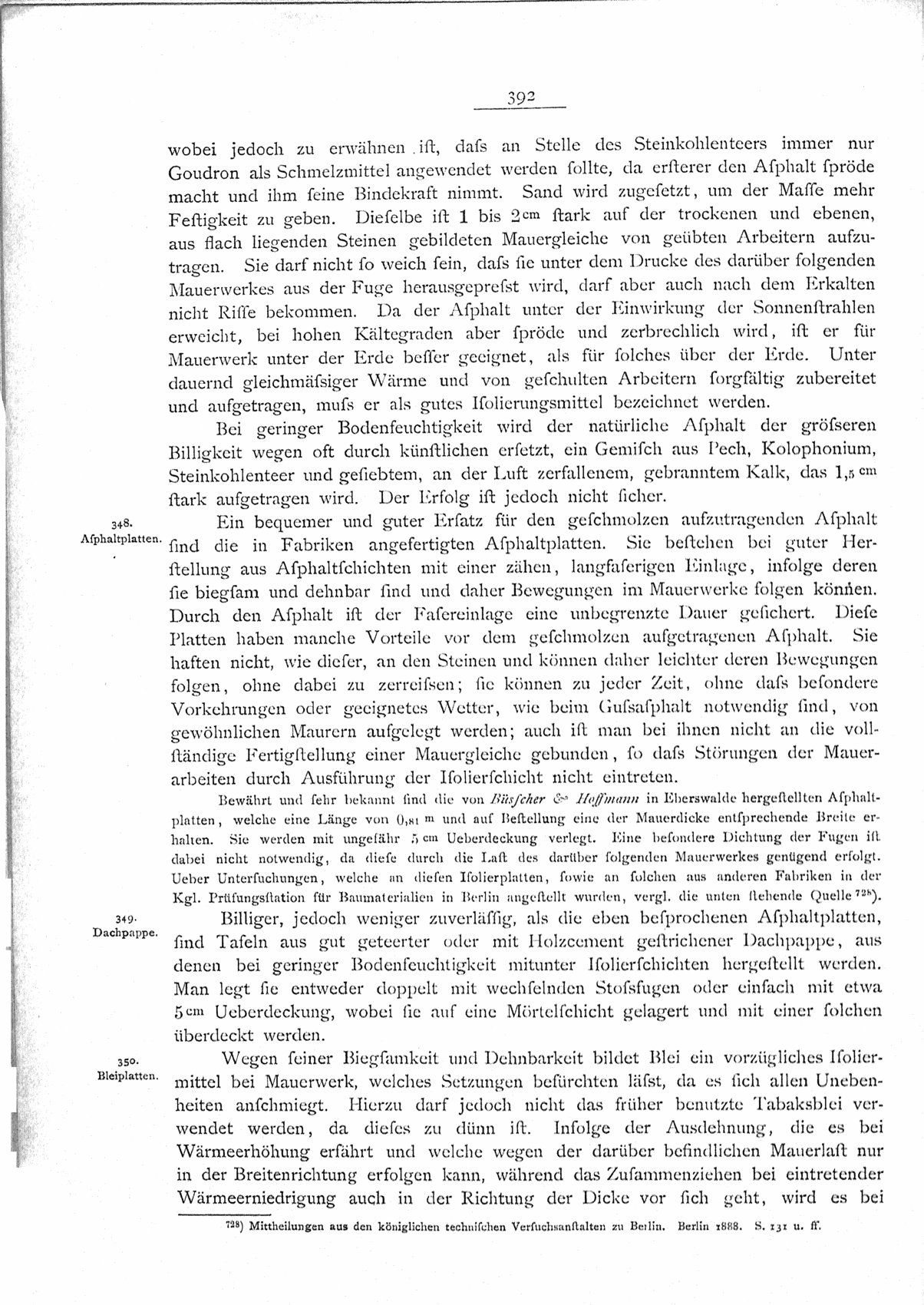 Bewährt und sehr bekannt sind die von Büsscher & Hoffmann in Eberswalde hergestellten Asphaltplatten, welche eine Länge von 0,81m und auf Bestellung eine der Mauerdicke entsprechende Breite erhalten. Sie werden mit ungefähr 5cm Ueberdeckung verlegt. Eine besondere Dichtung der Fugen ist dabei nicht notwendig, da diese durch die Last des darüber folgenden Mauerwerkes genügend erfolgt. Ueber Untersuchungen, welche an diesen Isolierplatten, sowie an solchen aus anderen Fabriken in der Kgl. Prüfungsstation für Baumaterialien in Berlin angestellt wurden, vergl. die unten stehende Quelle728).