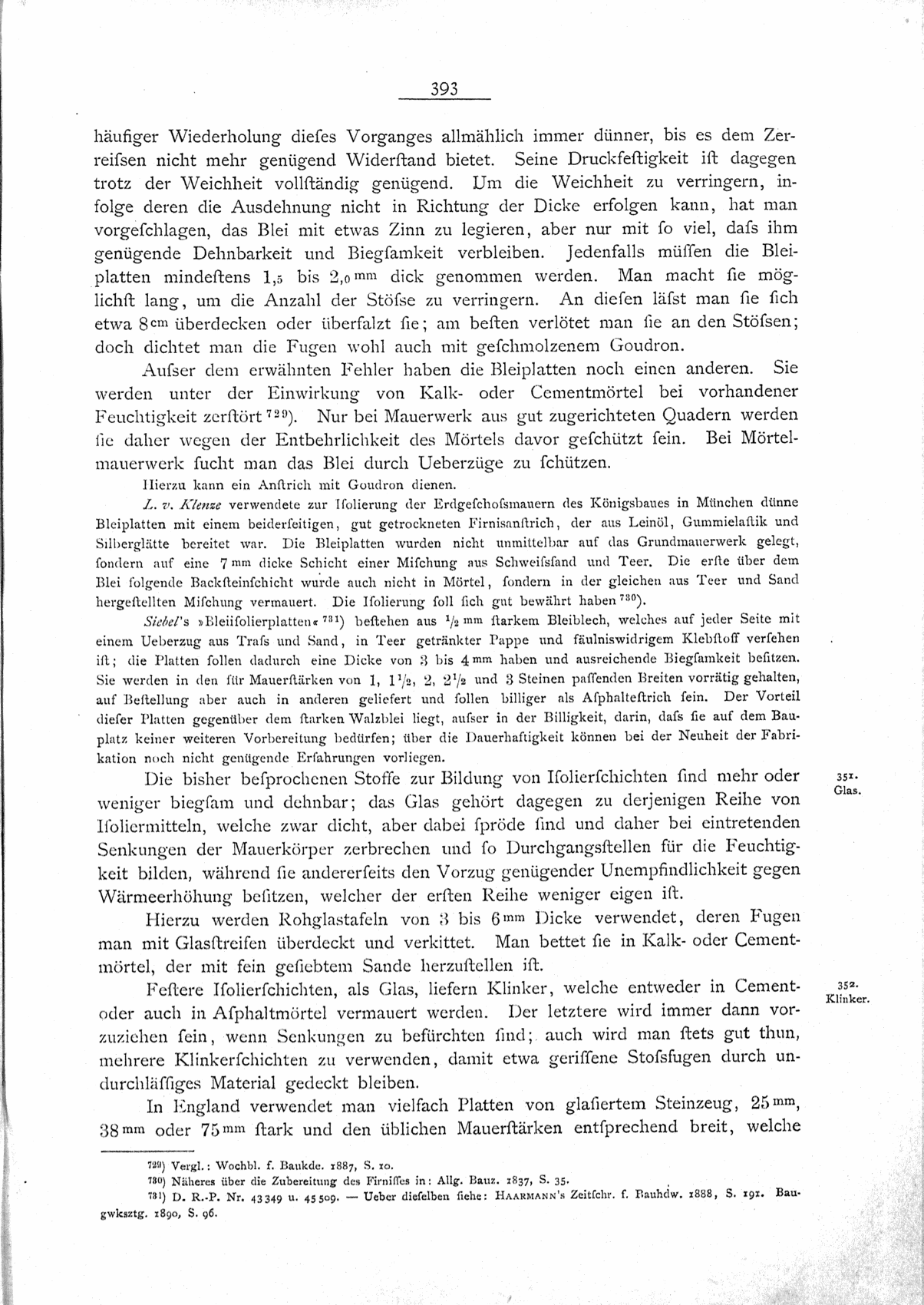 L. v. Klenze verwendete zur Isolierung der Erdgeschoßmauern des Königsbaues in München dünne Bleiplatten mit einem beiderseitigen, gut getrockneten Firnisanstrich, der aus Leinöl, Gummielastik und Silberglätte bereitet war. Die Bleiplatten wurden nicht unmittelbar auf das Grundmauerwerk gelegt, sondern auf eine 7mm dicke Schicht einer Mischung aus Schweißsand und Teer. Die erste über dem Blei folgende Backsteinschicht wurde auch nicht in Mörtel, sondern in der gleichen aus Teer und Sand hergestellten Mischung vermauert. Die Isolierung soll sich gut bewährt haben730).