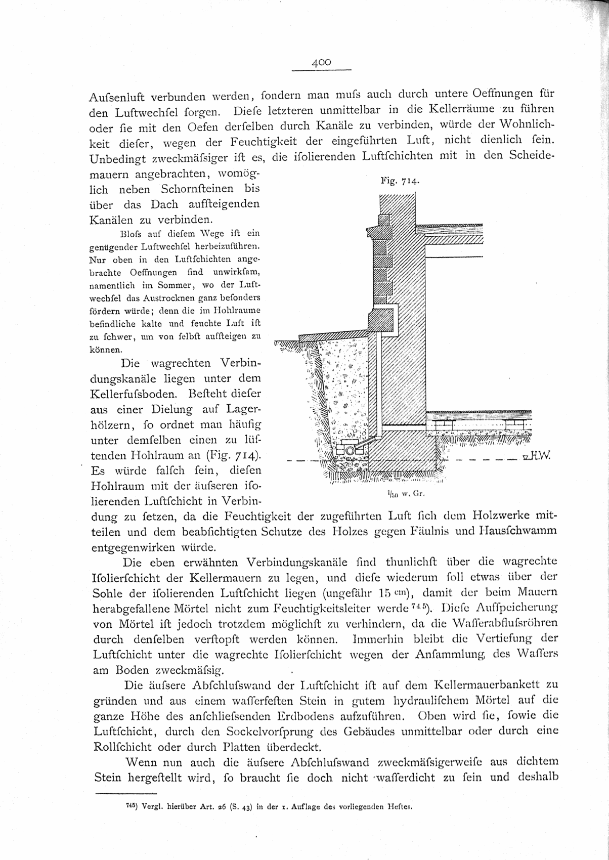 Für den ersten Fall sind auch bei anscheinend trockenem Boden Isolierungen wünschenswert, da die Verhältnisse durch unvorherzusehende Umstände sich ändern können und der Boden nie ganz trocken ist und in seinem Trockenheitsgrade nach der Jahreszeit wechselt. Die Isolierungen werden gewöhnlich nur gegen von unten aufsteigende Feuchtigkeit in den Mauern selbst angeordnet; sie können sich jedoch und sollten sich oft auch auf die seitlich andringende Feuchtigkeit und auf die Fußböden erstrecken. Die Dichtung der letzteren wird nicht nur der Trockenhaltung wegen, sondern auch wegen des Aufsteigens der namentlich bei wechselndem Grundwasserstand für schädlich erachteten Grundluft726) für wünschenswert gehalten.