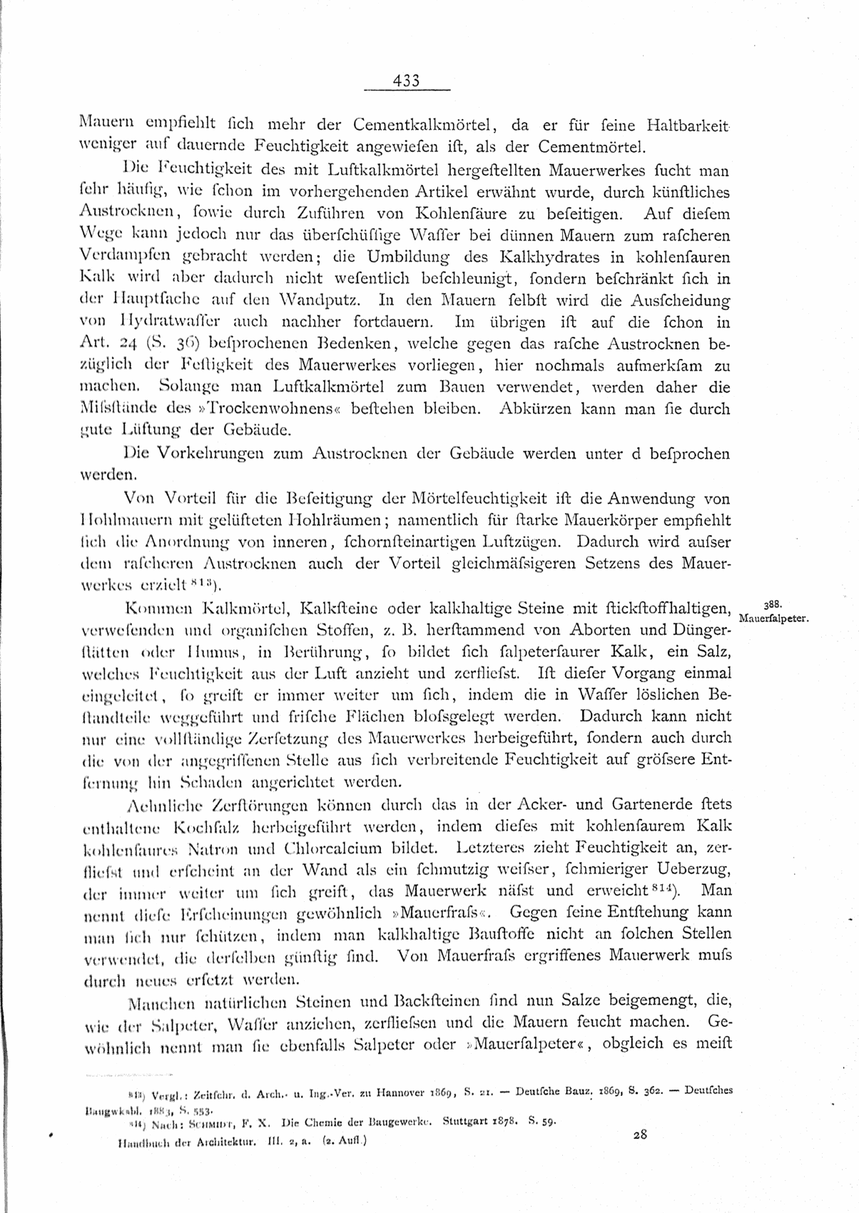 Aehnliche Zerstörungen können durch das in der Acker- und Gartenerde stets enthaltene Kochsalz herbeigeführt werden, indem dieses mit kohlensaurem Kalk kohlensaures Natron und Chlorcalcium bildet. Letzteres zieht Feuchtigkeit an, zerfließt und erscheint an der Wand als ein schmutzig weißer, schmieriger Ueberzug, der immer weiter um sich greift, das Mauerwerk näßt und erweicht814). Man nennt diese Erscheinungen gewöhnlich »Mauerfraß«. Gegen seine Entstehung kann man sich nur schützen, indem man kalkhaltige Baustoffe nicht an solchen Stellen verwendet, die derselben günstig sind. Von Mauerfraß ergriffenes Mauerwerk muß durch neues ersetzt werden.