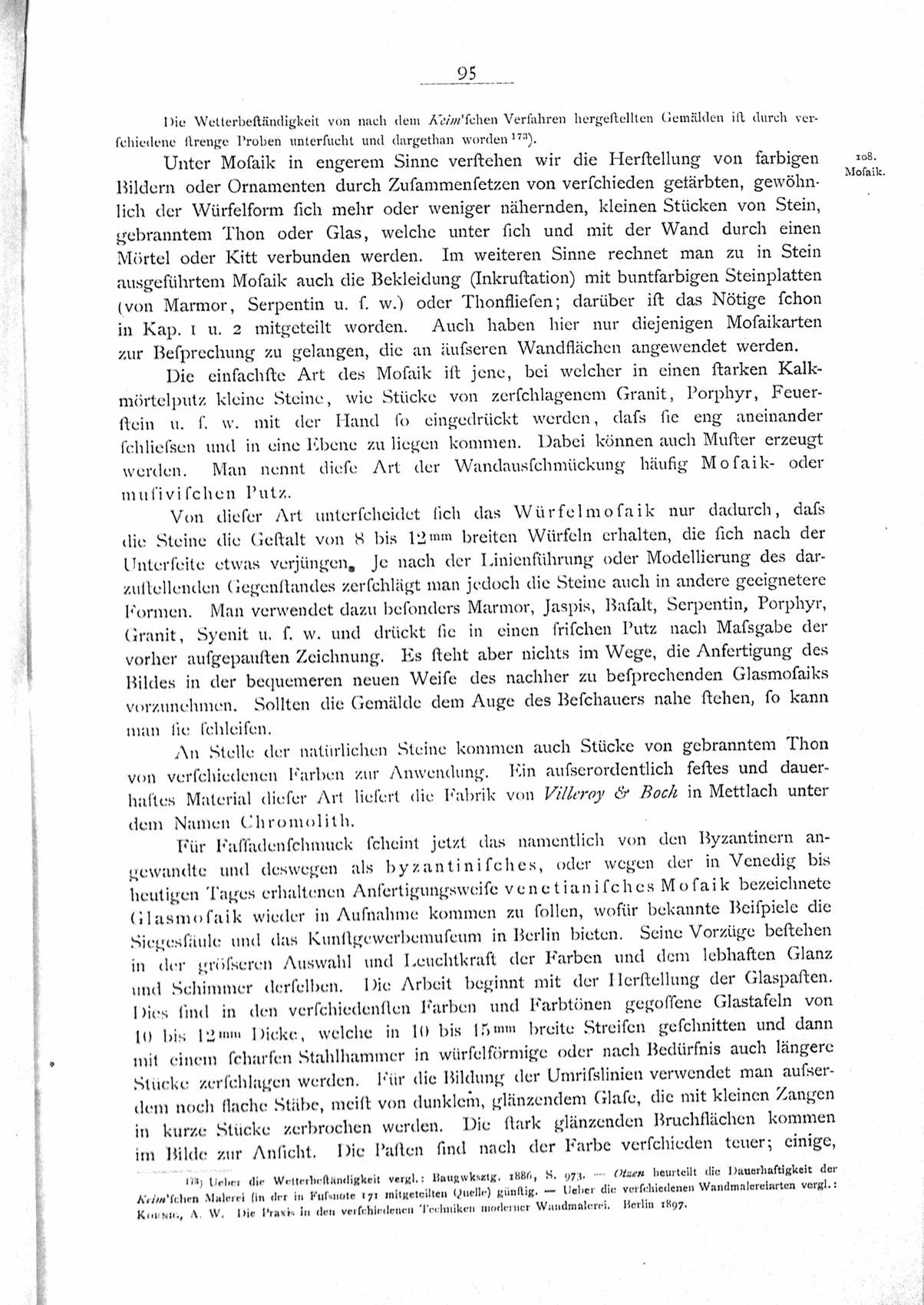 173) Ueber die Wetterbeständigkeit vergl.: Baugwksztg. 1886, S. 973. — Otzen beurteilt die Dauerhaftigkeit der Keim'schen Malerei (in der in Fußnote 171 mitgeteilten Quelle) günstig. — Ueber die verschiedenen Wandmalereiarten vergl.: Koenig, A. W. Die Praxis in den verschiedenen Techniken moderner Wandmalerei. Berlin 1897. ^