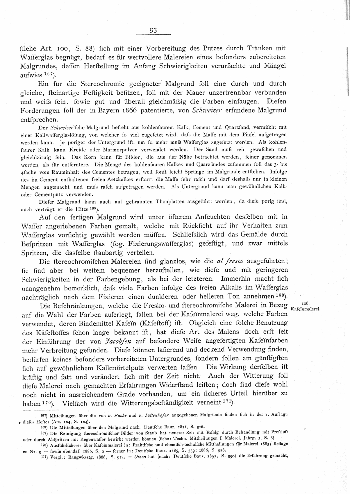 (siehe Art. 100, S. 88) sich mit einer Vorbereitung des Putzes durch Tränken mit Wasserglas begnügt, bedarf es für wertvollere Malereien eines besonders zubereiteten Malgrundes, dessen Herstellung im Anfang Schwierigkeiten verursachte und Mängel aufwies167).