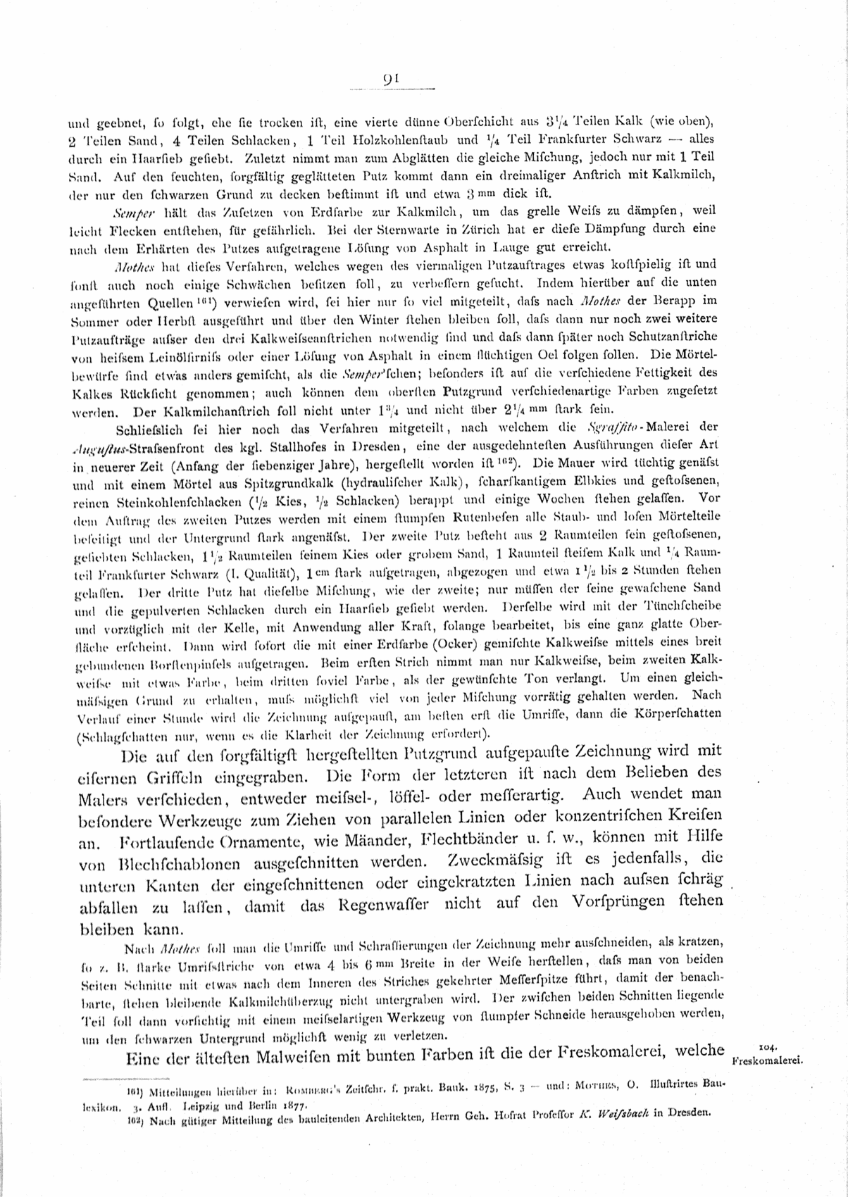 Mothes hat dieses Verfahren, welches wegen des viermaligen Putzauftrages etwas kostspielig ist und sonst auch noch einige Schwächen besitzen soll, zu verbessern gesucht. Indem hierüber auf die unten angeführten Quellen161) verwiesen wird, sei hier nur so viel mitgeteilt, daß nach Mothes der Berapp im Sommer oder Herbst ausgeführt und über den Winter stehen bleiben soll, daß dann nur noch zwei weitere Putzaufträge außer den drei Kalkweißeanstrichen notwendig sind und daß dann später noch Schutzanstriche von heißem Leinölfirniß oder einer Lösung von Asphalt in einem flüchtigen Oel folgen sollen. Die Mörtelbewürfe sind etwas anders gemischt, als die Semper'schen; besonders ist auf die verschiedene Fettigkeit des Kalkes Rücksicht genommen; auch können dem obersten Putzgrund verschiedenartige Farben zugesetzt werden. Der Kalkmilchanstrich soll nicht unter 13/4 und nicht über 13/4mm stark sein.