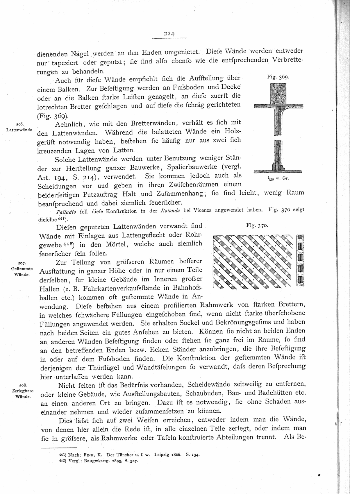 Solche Lattenwände werden unter Benutzung weniger Ständer zur Herstellung ganzer Bauwerke, Spalierbauwerke (vergl. Art. 194, S. 214), verwendet. Sie kommen jedoch auch als Scheidungen vor und geben in ihren Zwischenräumen einem beiderseitigen Putzauftrag Halt und Zusammenhang; sie sind leicht, wenig Raum beanspruchend und dabei ziemlich feuersicher.